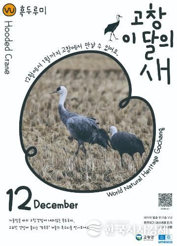 한국시사경제 사회팀 | 고창군이 12월 ‘고창갯벌 이달의 새’로 멸종위기 철새인 흑두루미(학명 Grus monacha)를 선정하고 겨울철 고창갯벌의 생태적 중요성을 알리기 위한 캠페인을 진행한다고 2일 밝혔다.