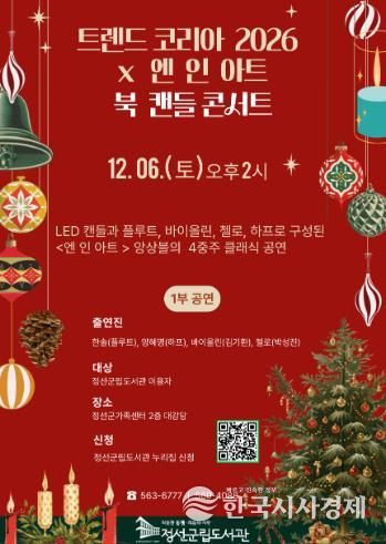 한국시사경제 권충언 기자 | 정선군립도서관은 오는 12월 6일 오후 2시, 정선군 가족센터 2층 대강당에서 ‘트렌드 코리아 2026 × 엔 인 아트 북 캔들 콘서트’를 개최한다고 2일 밝혔다.