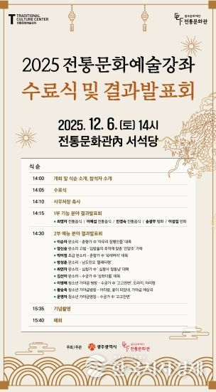 한국시사경제 광주취재본부 | 광주문화재단 전통문화관은 오는 12월 6일 오후 2시 전통문화관에서 광주광역시 무형유산 보유자와 수강생이 함께하는 ‘2025 전통문화예술강좌 수료식 및 결과발표회’를 개최한다.