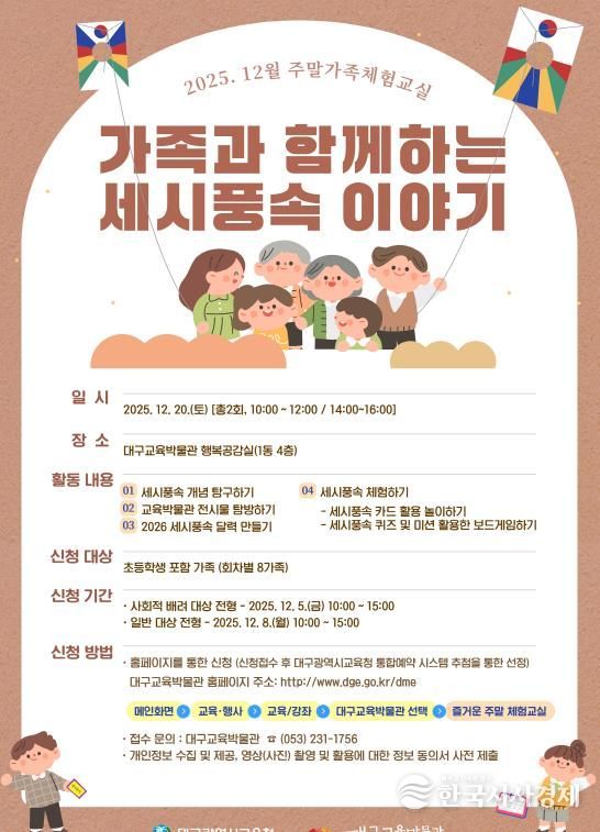 한국시사경제 대구취재본부 | 대구교육박물관은 오는 12월 20일 오전 10시와 오후 2시, 박물관 행복공감실에서 총 2회에 걸쳐 운영되는 12월 주말가족체험교실 ‘가족과 함께 하는 세시풍속 이야기’에 참여할 초등학생을 포함한 16가족(회차별 8가족)을 모집한다.