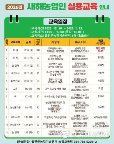 한국시사경제 권충언 기자 | 울진군은 오는 12월 10일부터 2026년 1월 15일까지 총 11회에 걸쳐 ‘2026년 새해농업인실용교육’을 운영한다.