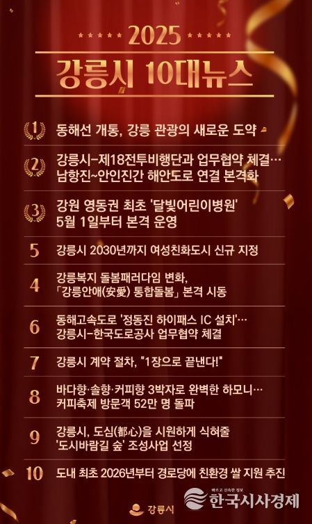 강릉시 관계자는 “올 한 해 강릉의 변화를 이끈 10대 뉴스는 공직자와 시민이 함께 만들어 낸 성과”라며, “이번 결과를 토대로 행정의 사각지대를 더욱 세심하게 살피고, 시민 누구나 일상에서 변화를 체감할 수 있도록 ‘더 큰 강릉, 더 따뜻한 강릉’을 향한 정책을 한층 속도감 있게 추진하겠다.”고 말했다.