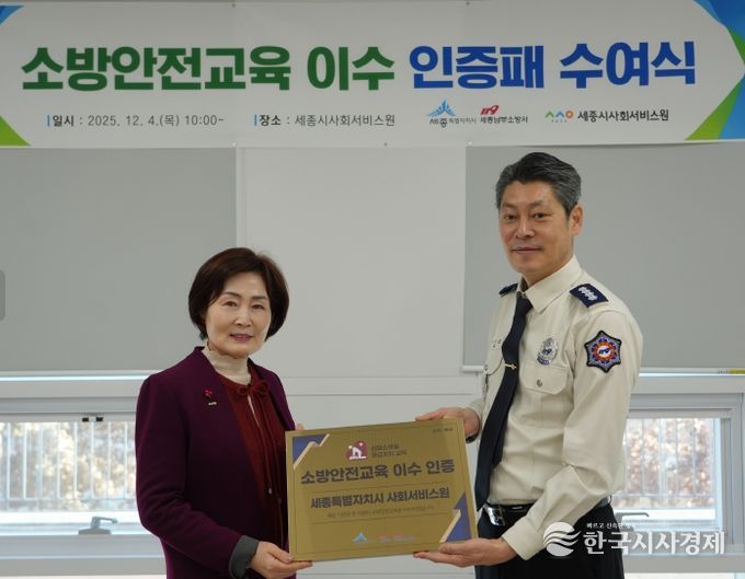 한국시사경제 세종취재분부 | 세종시사회서비스원은 지난 4일 세종남부소방서로부터 소방안전교육 우수기관으로 선정되어 인증패를 받았다고 밝혔다.