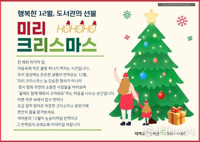 한국시사경제 문화팀 | 태백교육도서관은 12월 5일부터 7일까지 총 3일간 도서관 다목적실, 프로그램실 등에서 ‘12월의 행복! 미리크리스마스’ 체험 프로그램을 운영한다.