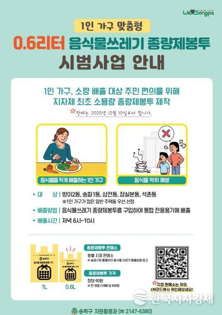 한국시사경제 사회팀 | 서울 송파구가 전국 지방자치단체 최초로 1인 가구에 최적화된 0.6ℓ 규격의 음식물쓰레기 종량제봉투를 오는 10일부터 시범 도입해 운영한다고 알렸다.