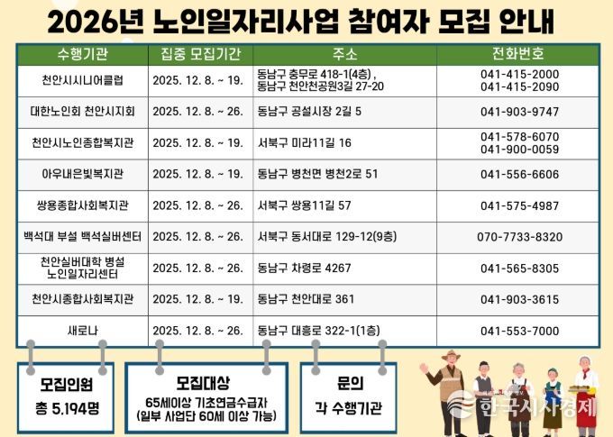 한국시사경제 충남취재본부 | 천안시는 ‘내년도 노인일자리 및 사회활동지원사업’ 참여자를 모집한다고 8일 밝혔다.