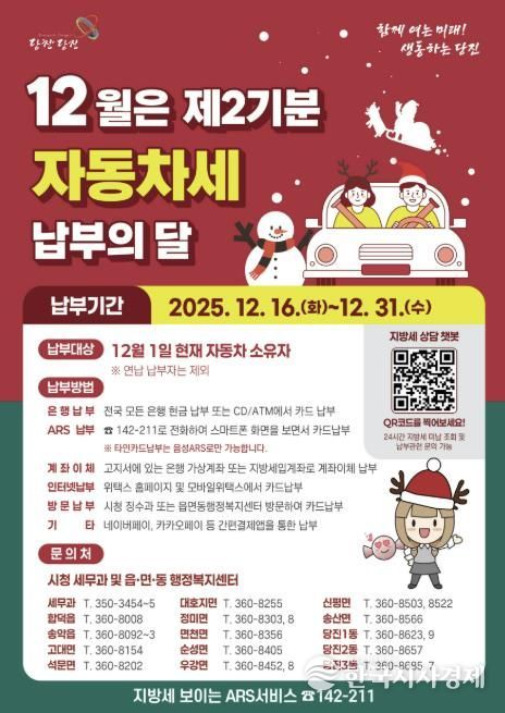 한편, 시는 생업 등으로 업무시간 내 방문이 어려운 시민들의 편의를 위해 자동차세 납부 기간인 12월 17일, 24일, 31일 오후 6시부터 9시까지 당진시청 1층 세무과 43번·44번 창구에서 ‘야간 세무민원실’을 운영해 자동차세를 비롯한 지방세 관련 민원 서비스를 제공할 예정이다.
