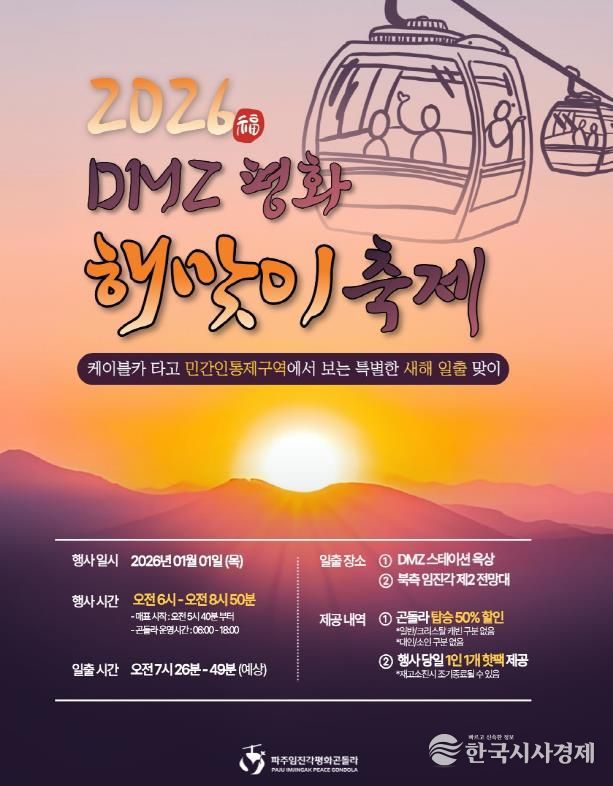 한국시사경제 문화팀 | 파주시는 2026년 1월 1일 새해 첫날, 파주임진각평화곤돌라에서 임진강과 디엠제트 일대를 조망하며 새해 소망을 기원하는 녪디엠지 평화 해맞이 축제’를 진행한다고 밝혔다.
