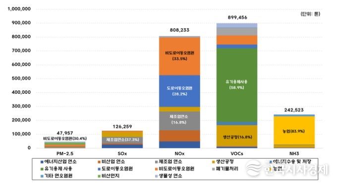 2023년 국가 대기오염물질 배출량 산정 결과, 초미세먼지(PM-2.5) 연간 배출량은 2022년보다 1만 2천톤(19.3%) 감소한 4만 7,957톤으로 산정됐다. 질소산화물(NOx)은 4만 9천톤(5.7%), 휘발성유기화합물(VOCs)은 3만 9천톤(4.1%), 황산화물(SOx)은 5백톤(0.4%) 감소했으나, 암모니아(NH3)는 3백톤(0.1%) 소폭 증가했다.