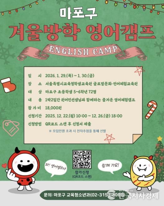 한국시사경제 노승선 기자 | 마포구는 겨울방학을 맞아 관내 초등학교 5~6학년 학생 72명을 대상으로 2026년 1월 29일부터 30일까지 1박 2일 일정의 겨울방학 영어캠프를 운영한다.