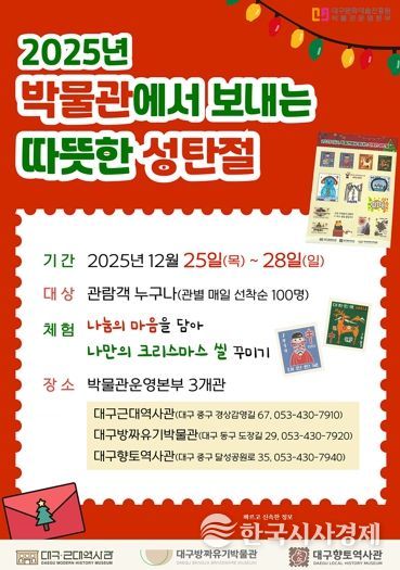 한국시사경제 대구취재본부 | 대구문화예술진흥원 박물관운영본부 소속 대구 시립 3개 박물관(대구근대역사관·대구방짜유기박물관·대구향토역사관)에서는 성탄절을 맞아, 12월 25일부터 28일까지 관람객을 대상으로 ‘2025년 박물관에서 보내는 따뜻한 성탄절 –나만의 크리스마스 씰 꾸미기-’ 문화행사를 진행한다.