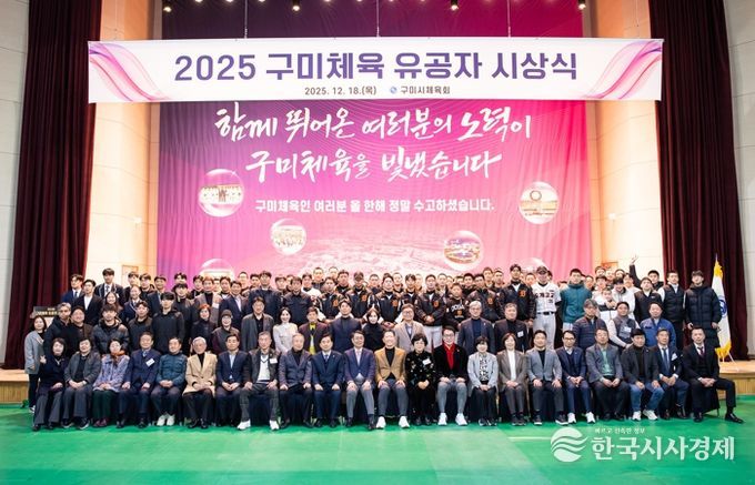 한국시사경제 경북취재본부 | 구미시는 지난 18일 복합스포츠센터 2층 다목적경기장에서 ‘2025년 구미체육 유공자 시상식’을 개최했다. 이날 행사에는 김장호 구미시장과 박교상 구미시의회 의장을 비롯해 체육인 400여 명이 참석했다.