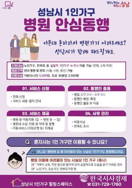 한국시사경제 경기취재본부 | 성남시는 ‘1인 가구 병원 안심 동행 서비스’ 추진을 위해 전문 인력을 기존 4명에서 5명으로 늘렸다고 22일 밝혔다.