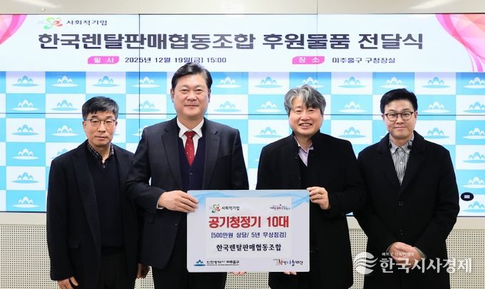 한국시사경제 윤광희 기자 | 인천 미추홀구는 지난 19일 사회적기업 한국렌탈판매협동조합(대표 정영이)으로부터 공기청정기 10대를 전달받았다.