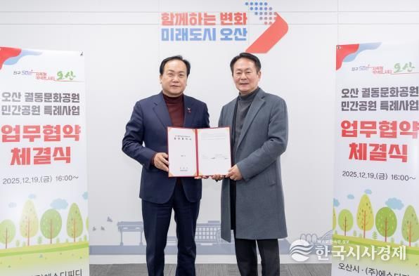 한국시사경제 권충현 기자 | 오산시는 12월 19일 오산시청에서 궐동문화공원 민간공원조성 특례사업의 원활한 추진을 위해 사업 시행자인 ㈜에스디피디와 협약을 체결했다.