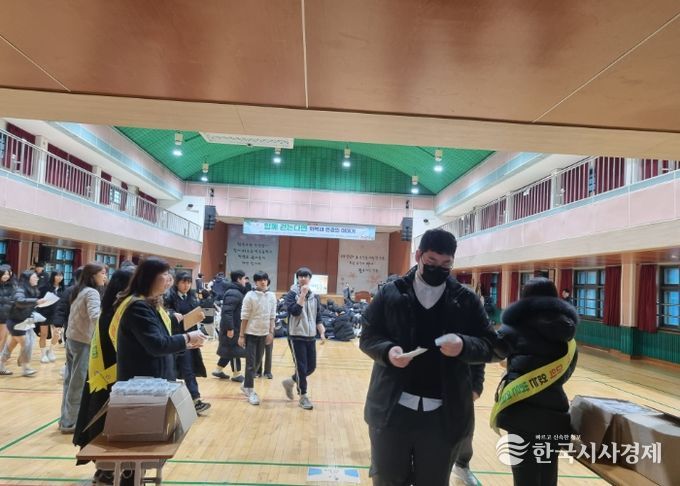 한국시사경제 경기북부취재본부 | 경기도연천교육지원청은 12월 19일, 전곡중학교에서 학생 약 550명을 대상으로 교육환경보호구역 제도 및 마약 예방 홍보 캠페인을 실시했다.