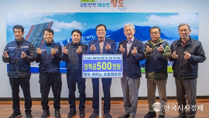 한국시사경제 김숙영 기자 | 영도 마리노 오토캠핑장(기간제근로자 일동)은 지난 12월 19일 영도구청을 방문하여 우수한 지역인재 양성을 위해 (재)행복영도장학회에 500만 원을 기탁했다.