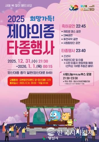 나동연 양산시장은 “2026년은 양산방문의 해이자 시 승격 30주년을 맞이하는 뜻깊은 해로, 이번 제야의 종 타종행사는 시민들과 함께 꽃피운 양산시의 지난 30년을 되돌아보고 새로운 100년을 향한 힘찬 발걸음을 내딛는 의미 있는 자리”라며 “시민 여러분 모두 2025년 한해 마무리 잘하시고 희망찬 새해의 첫 순간을 함께하시길 바란다”고 말했다.