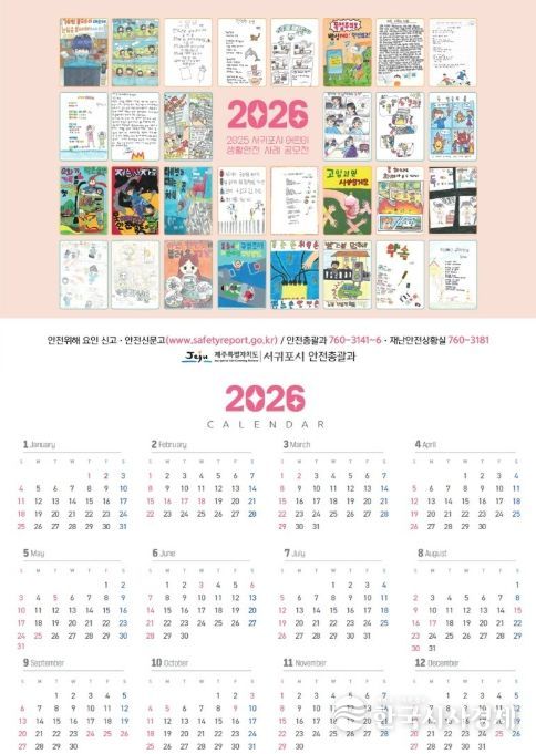 한국시사경제 노승선 기자 | 서귀포시는 지역사회에 생활 속 안전의식 확산을 위해 2025 어린이 생활안전사례 공모전 수상작 30작품을 활용한 안전문화달력 1,500부를 제작하여 전 부서와 학교, 유관기관에 배부했다고 밝혔다.