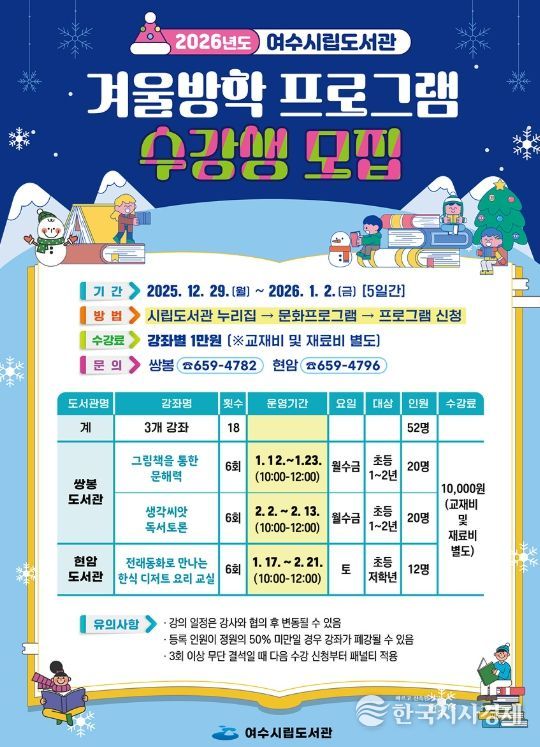 한국시사경제 전남취재본부 | 여수시립도서관은 오는 12월 29일부터 2026년 1월 2일까지 5일간 관내 초등학생을 대상으로 2026년 겨울방학 프로그램 수강생 52명을 선착순 모집한다.