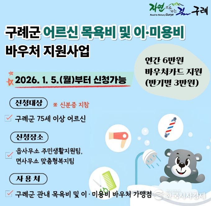 한국시사경제 문화팀 | 구례군은 75세 이상 어르신들의 건강하고 활기찬 노후생활 보장과 지역경제 활성화를 도모하기 위해 '어르신 목욕비 및 이·미용비 바우처 지원사업'을 본격 추진한다고 밝혔다.