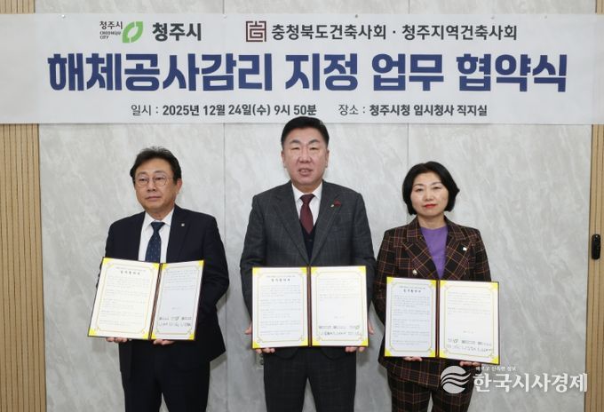 한국시사경제 오영주 기자 | 청주시는 24일 대한건축사협회 충청북도건축사회, 청주지역건축사회와 ‘건축물 해체공사 감리자 지정 업무대행에 관한 업무협약(MOU)’을 체결한다.