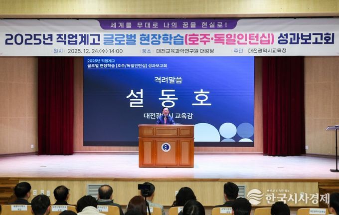 한국시사경제 대전취재본부 | 대전시교육청은 12월 24일 대전교육과학연구원에서‘2025년 직업계고 글로벌 현장학습 성과보고회’를 개최했다고 밝혔다. 이번 보고회는 올해 호주·독일 인턴십 프로그램에 참여한 학생들의 성과를 공유하고, 다음 연도 참가 희망학생과 학부모에게 프로그램 운영 내용을 안내하기 위해 마련됐다.