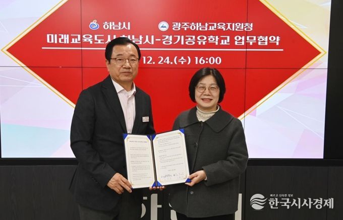 한국시사경제 기동취재팀 | 하남시는 24일 시청 집무실에서 경기도광주하남교육지원청과 지역 교육 협력을 강화하기 위한 '미래교육도시 하남시–경기공유학교 업무협약'을 체결했다고 밝혔다. 이날 협약식에는 이현재 하남시장을 비롯해 오성애 광주하남교육지원청 교육장 등 양 기관 관계자들이 참석했다.