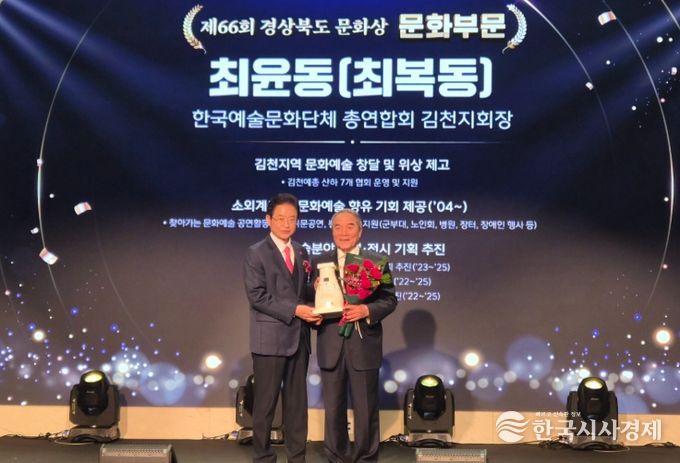 한국시사경제 권충언 기자 | 김천시는 지난 23일 안동 스탠포드호텔에서 열린 제66회 경상북도 문화상 시상식에서 최복동 한국예총 김천지회장(문화 부문), 김대철 도문요 대표(시각예술 부문)가 각각 수상했다고 밝혔다.