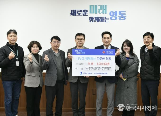 한국시사경제 사회팀 | 수원시 영통구는 지난 24일 한국자산관리공사 경기지역본부에서 관내 경제적으로 어려움을 겪는 이웃을 위해 성금 500만 원을 기부했다고 밝혔다.