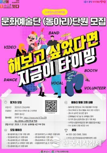 한국시사경제 노승선 기자 | 양산시 소주청소년문화의집은 청소년의 문화예술 역량 강화와 자율적인 동아리 활동 지원을 위해 '2026 소주청소년문화의집 청소년문화예술단' 단원을 모집한다.