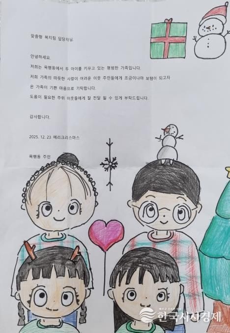 편지는 두 아이를 키우는 가정이라는 소개와 함께 도움이 필요한 이웃을 위하는 따뜻한 마음과 아이들이 직접 그린 눈사람, 선물 상자 등으로 꾸며져 따스함을 더했다.