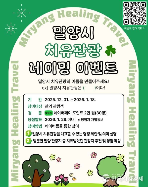 이경숙 관광진흥과장은 “이번 작명 이벤트는 관광객의 언어로 밀양 치유관광의 이미지를 함께 만들어 가는 과정”이라며 “앞으로도 밀양만의 치유관광 콘텐츠를 알릴 수 있는 다양한 참여형 홍보를 이어갈 계획”이라고 말했다.