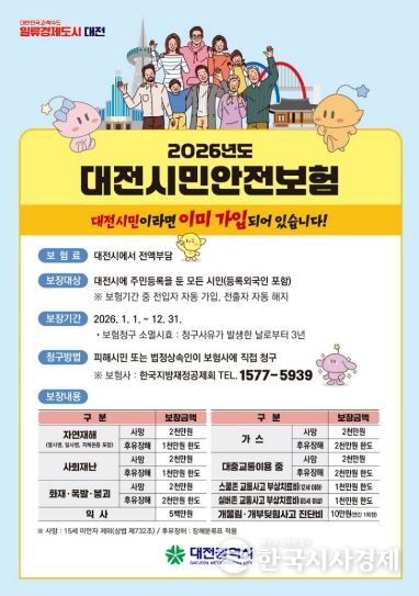 한국시사경제 대전취재본부 | 대전시는 각종 재난․사고로부터 시민의 생활안전을 지원하기 위해 운영 중인 시민안전보험의 보장 항목을 올해부터 확대 운영한다.