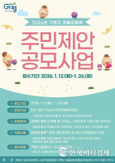 가평군 관계자는 “이번 공모사업을 통해 주민이 주체가 돼 마을의 문제를 해결하고, 공동체 활동을 통해 이웃 간 신뢰와 연대가 회복되길 기대한다”며 “관심 있는 주민과 공동체의 적극적인 참여를 바란다”고 말했다.