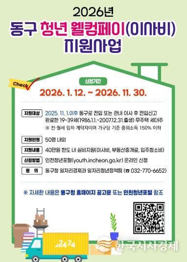 한국시사경제 문화팀 | 인천 동구는 청년의 주거비 부담 완화와 안정적인 정착을 위한 ‘청년 웰컴페이(이사비) 지원사업’을 추진한다고 밝혔다.