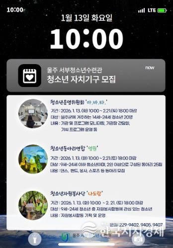 한국시사경제 울산취재본부 | 울주군시설관리공단 서부청소년수련관은 청소년의 참여 활성화와 자치 역량 강화를 위해 2026년도 청소년 자치기구 신규 참여 청소년을 모집한다고 밝혔다.
