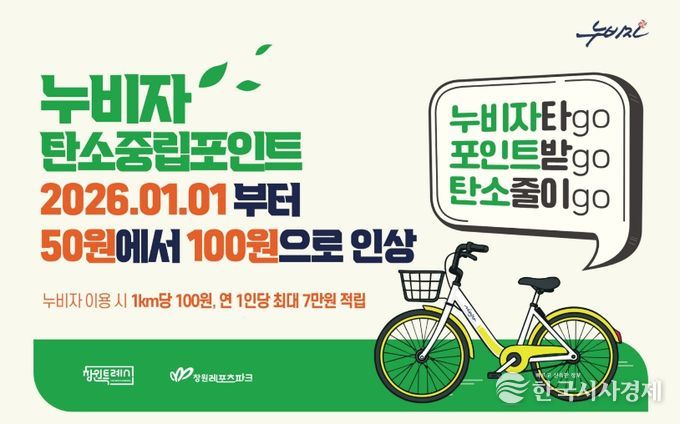 한국시사경제 사회팀 | 창원특례시는 공영자전거 “누비자” 이용 시민에게 지급하는 탄소중립포인트 인센티브가 2026년 1월 1일부터 1km당 50원에서 100원으로 인상된다고 밝혔다.