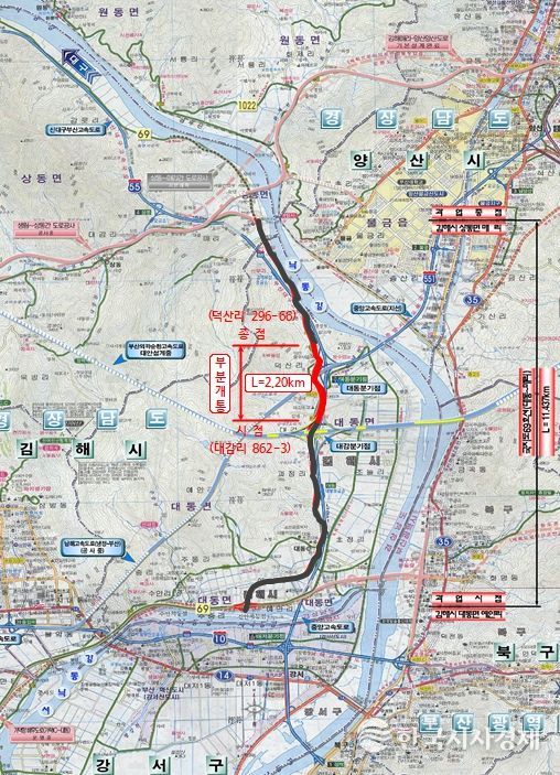 한국시사경제 노승선 기자 | 김해시는 12일 오전 10시 국지도 69호선 일부구간(대동 감내교차로~신암교차로) 2.2km가 개통됐다고 밝혔다.