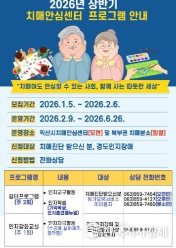 한편, 익산시 치매안심센터는 조기검진, 치매치료관리비 지원, 조호물품 제공 등 다양한 치매관리사업을 추진하고 있으며, 관련 문의는 치매상담콜센터로 하면 된다.
