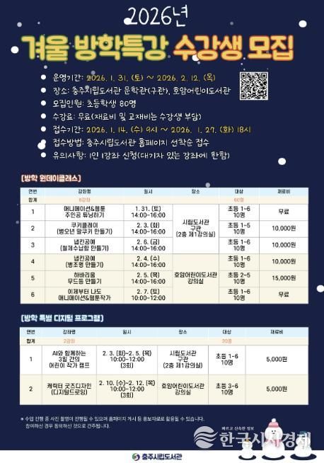 한국시사경제 충북취재본부 | 충주시립도서관은 겨울방학을 맞아 관내 초등학생을 대상으로 겨울 방학특강 수강생을 모집한다고 13일 밝혔다.