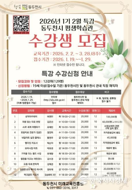 한국시사경제 경기북부취재본부 | 동두천시는 시민의 자기계발과 평생학습 참여 기회를 확대하기 위해 2026년 평생학습관 2월 특강 수강생을 모집한다고 밝혔다.