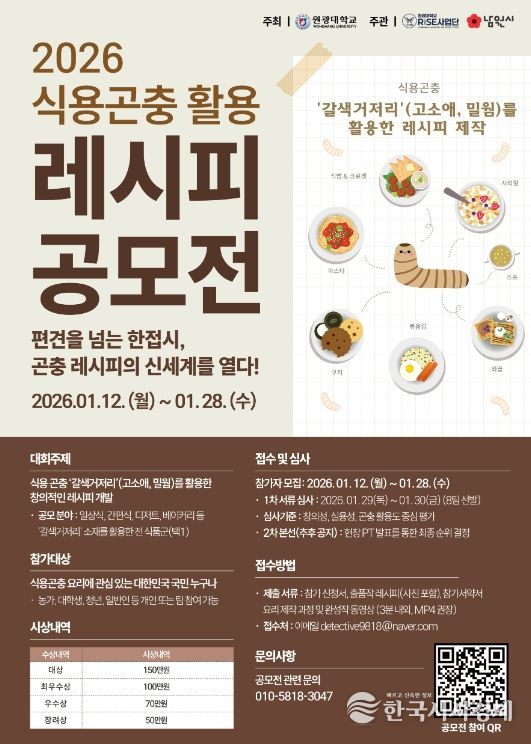 남원시 관계자는 “곤충 식품에 대한 소비자 인식을 개선하고 곤충 단백질의 효능과 가치를 친숙하게 하여 곤충 식품에 대한 국민 정서상 거리를 좁히고, 곤충 식품의 이미지 전환을 위해 【2026 식용 곤충 활용 레시피 공모전】을 추진하게 됐다.”고 말했으며, “식품으로서의 곤충 원료를 대량 생산하기 위해 남원시는 2024년부터 곤충산업 거점 단지 조성 사업을 추진해 곤충산업을 바이오산업 핵심 기반으로 고도화하고 있으며, 전문가들과 협업해 곤충의 가치를 높이고 활용 범위를 넓혀가는 추세로 곤충산업에 대한 많은 관심과 응원 부탁드린다“라고 말했다.