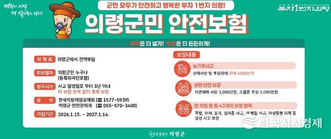 한국시사경제 의료보건팀 | 의령군은 일상생활 중 예기치 못한 재난과 사고로부터 군민의 생활 안정을 지원하기 위해 ‘2026년 군민안전보험’에 갱신 가입하고, 1월 15일부터 본격 운영에 들어간다고 밝혔다.