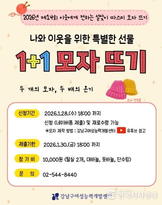 한국시사경제 이정이 기자 | 꿈이 모이는 도시, 미래를 그리는 강남구가 주민들이 직접 만든 털모자를 어르신과 장애인 등 소외계층에게 전달하는 ‘따스미 모자 뜨기’ 참가자를 1월 28일까지 모집한다.