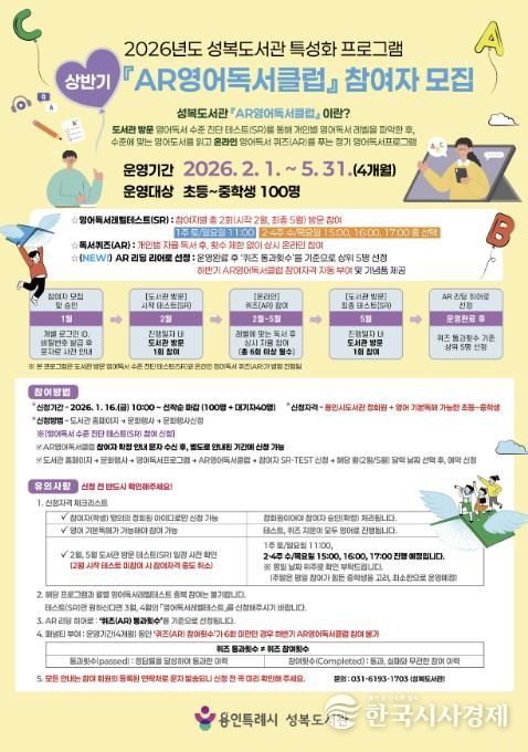한국시사경제 사회팀 | 용인특례시 성복도서관은 오는 16일부터 2026년 ‘AR(Accelerated Reader)영어독서클럽’ 상반기 참여자 100명을 모집한다고 15일 밝혔다.