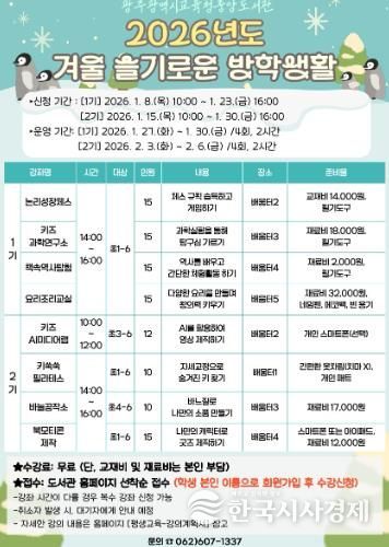 한국시사경제 광주취재본부 | 광주시교육청중앙도서관은 겨울방학을 맞아 오는 27일부터 2월 6일까지 초등학생을 대상으로 ‘겨울 슬기로운 방학생활’을 운영한다.