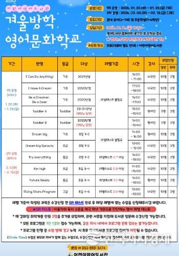 시 관계자는 "겨울방학 동안 어린이들이 즐겁게 영어를 접하며 성장할 수 있도록 다양한 프로그램을 준비했다"며 "어린이영어도서관에서 의미 있고 유익한 방학을 보내길 바란다"고 말했다.