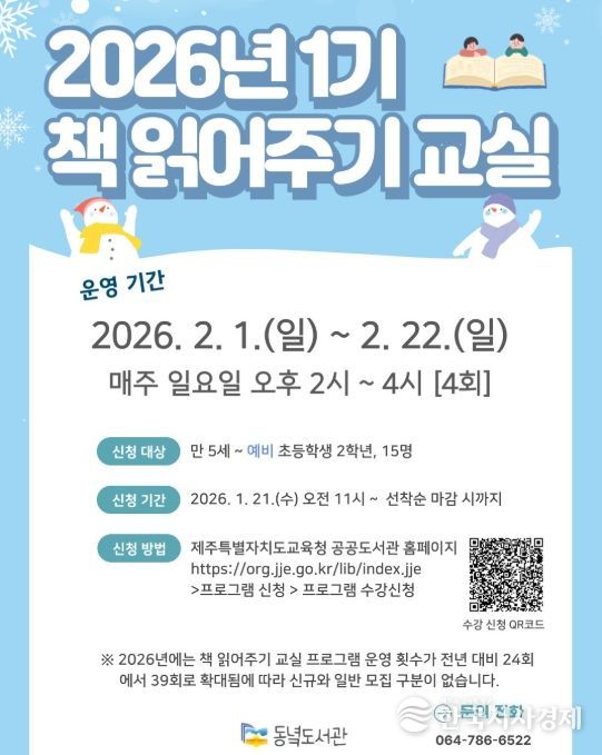 한국시사경제 노승선 기자 | 제주도교육청 동녘도서관은 2월 1일부터 22일까지 평생교육실에서 유아 및 저학년 어린이의 독서 흥미와 창의력 향상을 위한 ‘2026년 1기 책 읽어주기 교실’을 운영한다.