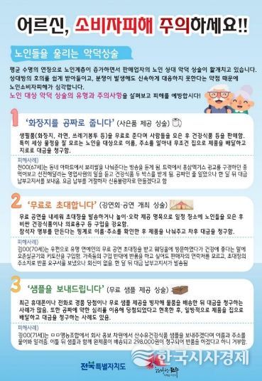 한국시사경제 전북취재본부 | 최근 생필품 염가 판매나 무료 사은품 제공을 앞세워 소비자를 유인한 뒤 고가의 건강보조식품이나 전자제품 등을 판매하는 사례가 늘고 있는 가운데, 전주시가 피해 예방을 위해 주의해 줄 것을 당부했다.